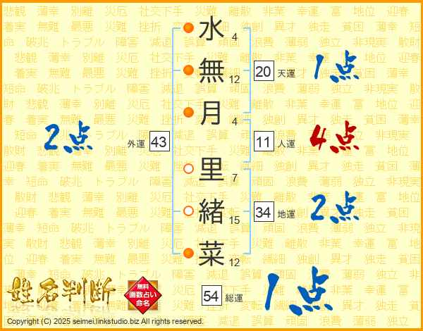 水(4画)無(12画)月(4画) 里(7画)緒(15画)菜(12画)