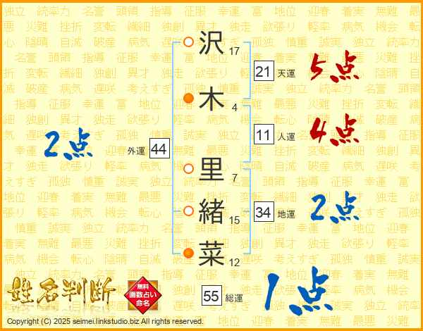 沢(17画)木(4画) 里(7画)緒(15画)菜(12画)