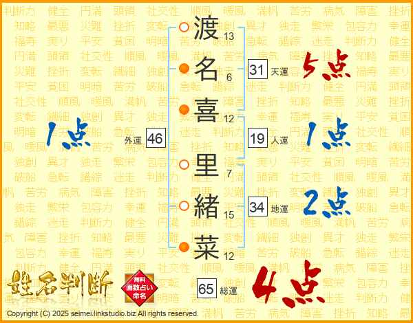 渡(13画)名(6画)喜(12画) 里(7画)緒(15画)菜(12画)