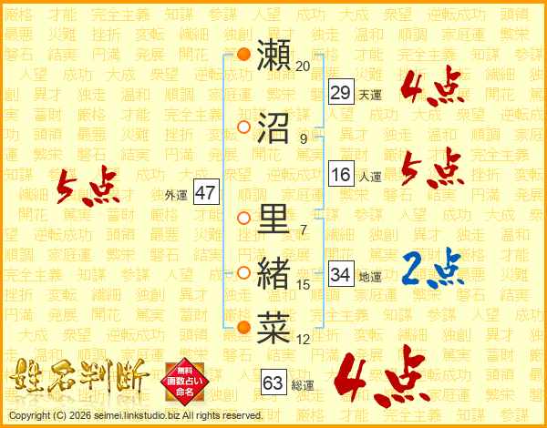 瀬沼里緒菜さんの総運は63画の4点!
