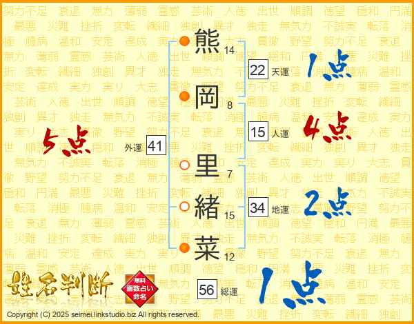 熊(14画)岡(8画) 里(7画)緒(15画)菜(12画)