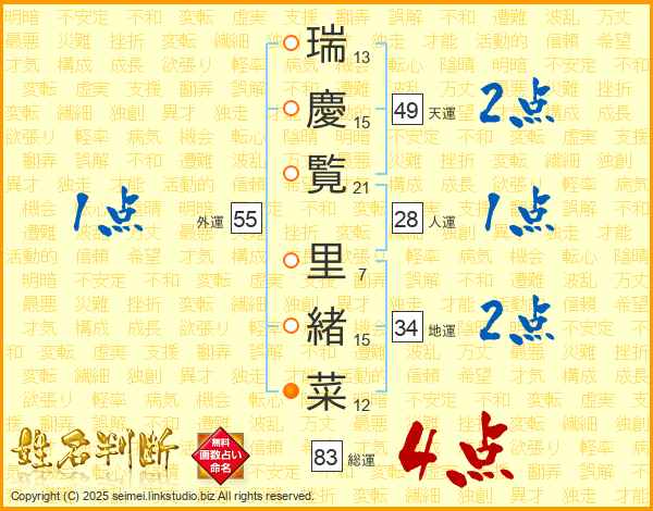 瑞慶覧里緒菜さんの総運は83画の4点!