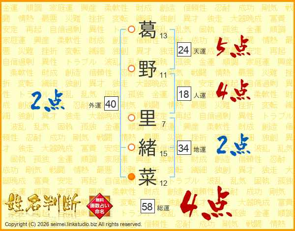 葛(13画)野(11画) 里(7画)緒(15画)菜(12画)