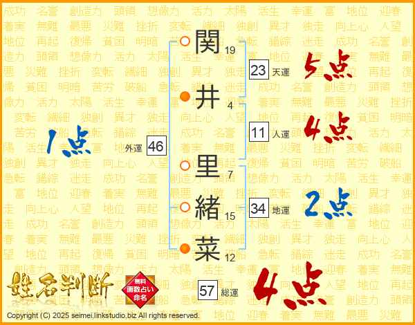 関(19画)井(4画) 里(7画)緒(15画)菜(12画)