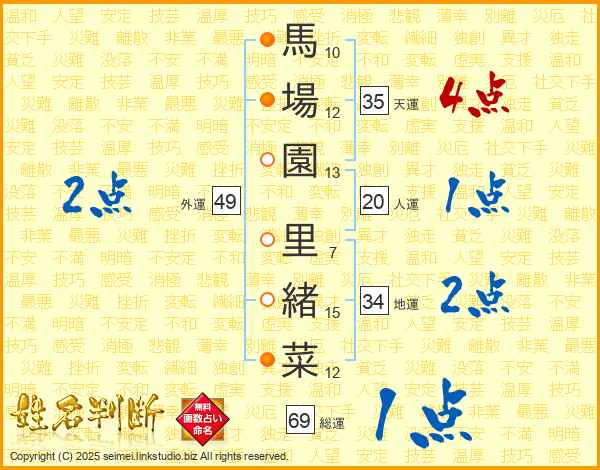 馬(10画)場(12画)園(13画) 里(7画)緒(15画)菜(12画)