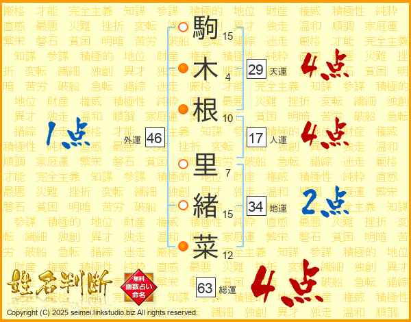 駒(15画)木(4画)根(10画) 里(7画)緒(15画)菜(12画)