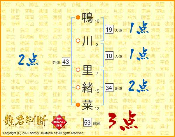 鴨川里緒菜さんの総運は53画の3点!