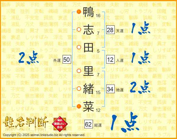鴨(16画)志(7画)田(5画)  里(7画)緒(15画)菜(12画)