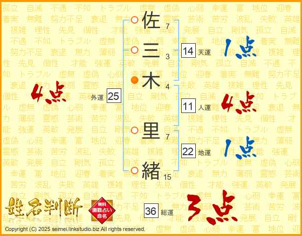 佐(7画)三(3画)木(4画) 里(7画)緒(15画)