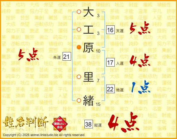 大工原里緒さんの総運は38画の4点!