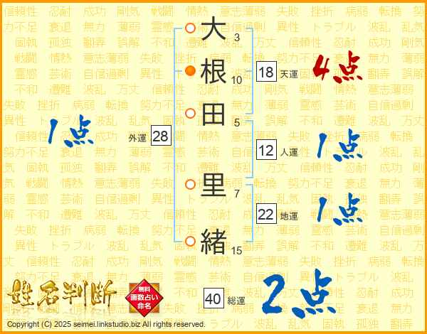 大(3画)根(10画)田(5画) 里(7画)緒(15画)