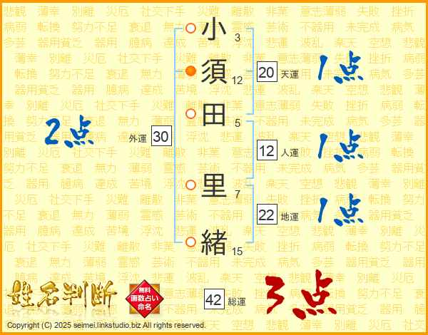 小(3画)須(12画)田(5画) 里(7画)緒(15画)