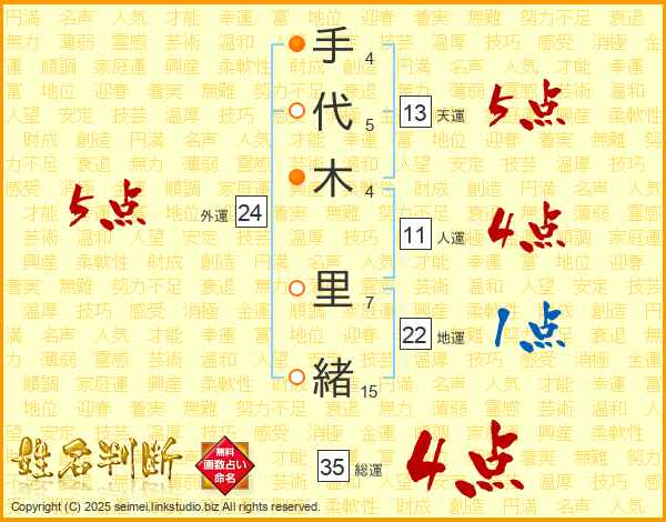 手(4画)代(5画)木(4画) 里(7画)緒(15画)