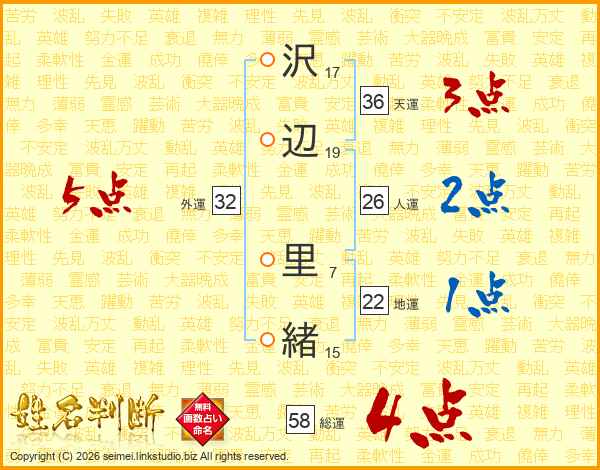 沢(17画)辺(19画) 里(7画)緒(15画)