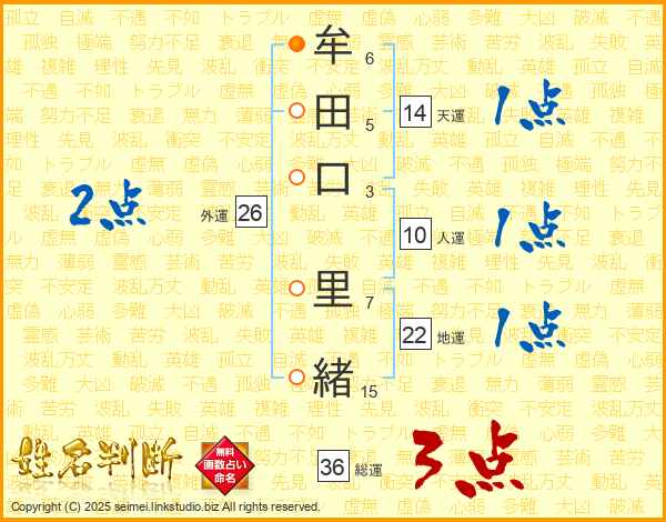 牟(6画)田(5画)口(3画) 里(7画)緒(15画)