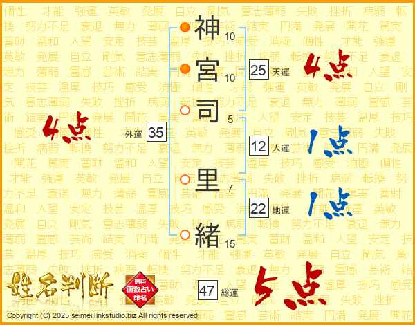 神(10画)宮(10画)司(5画) 里(7画)緒(15画)