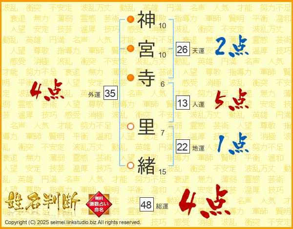 神(10画)宮(10画)寺(6画) 里(7画)緒(15画)