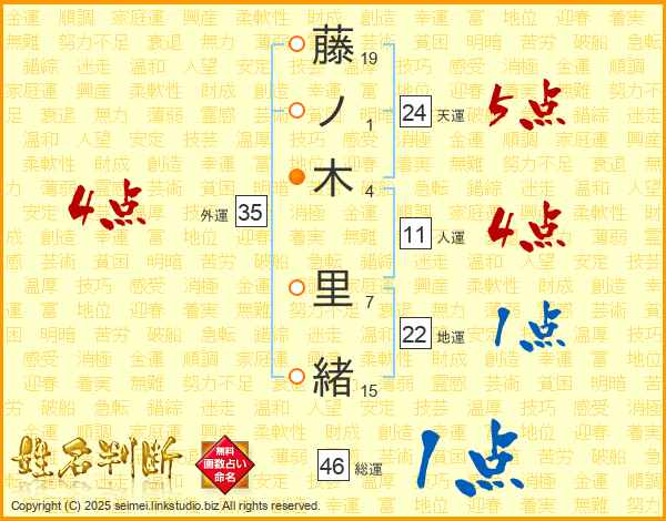 藤(19画)ノ(1画)木(4画) 里(7画)緒(15画)
