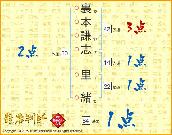 裏(13画)本(5画)謙(17画)志(7画) 里(7画)緒(15画)