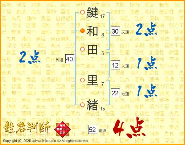 生活面を象徴する運勢です。外部から受ける影響力を表し、結婚運、家庭運や職場、環境への順応性を表します。総運から人運を引いた画数。姓や名が1文字の場合を除く。