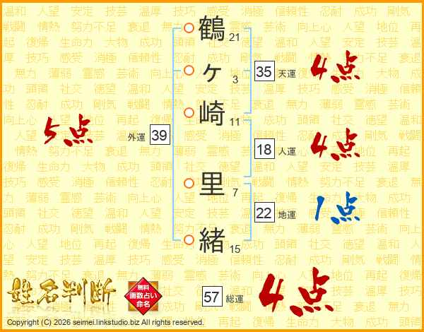鶴ヶ崎里緒さんの外運は39画の5点!