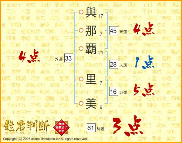 與(17画)那(7画)覇(21画) 里(7画)美(9画)