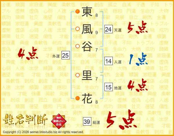 東風谷里花さんの総運は39画の5点!