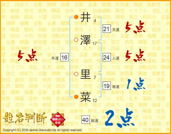 井澤里菜さんの人運は24画の5点!