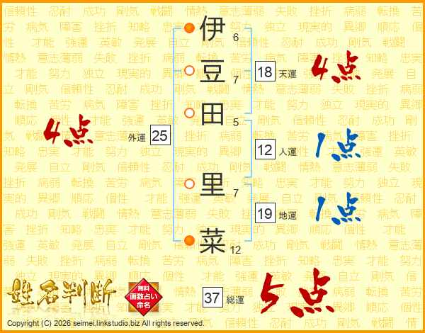 伊(6画)豆(7画)田(5画) 里(7画)菜(12画)