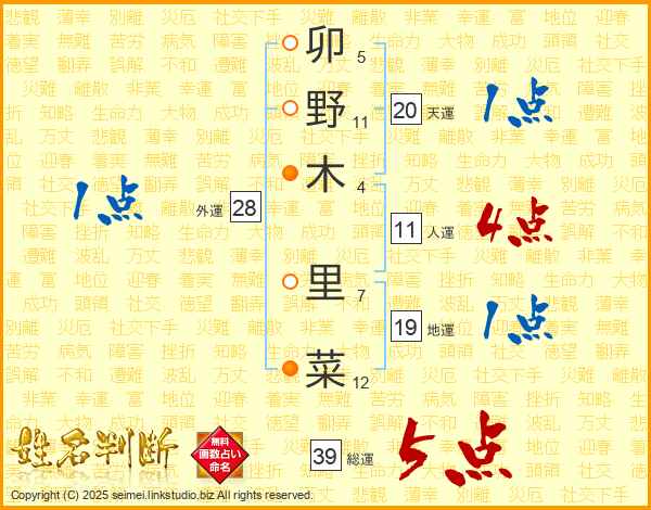 卯(5画)野(11画)木(4画) 里(7画)菜(12画)