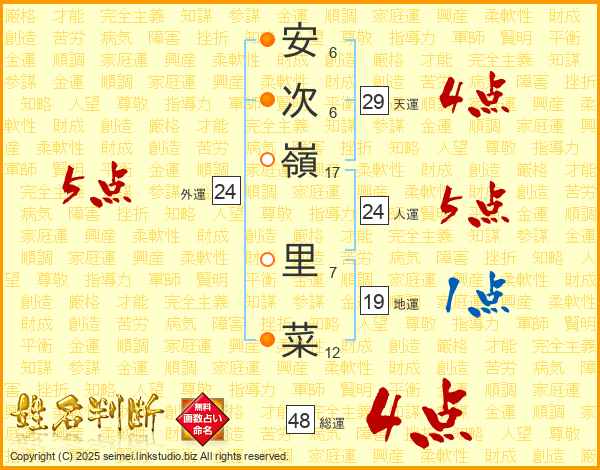 安(6画)次(6画)嶺(17画) 里(7画)菜(12画)