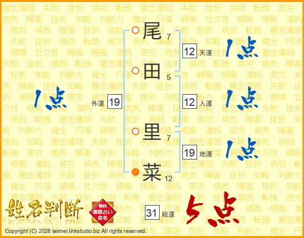 尾(7画)田(5画) 里(7画)菜(12画)