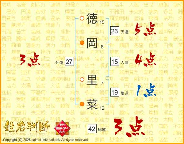 徳(15画)岡(8画) 里(7画)菜(12画)