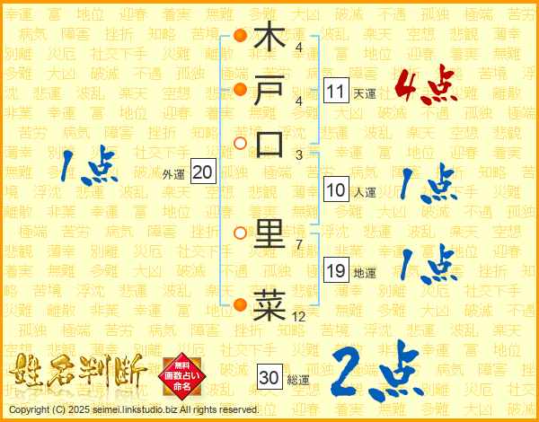 生活面を象徴する運勢です。外部から受ける影響力を表し、結婚運、家庭運や職場、環境への順応性を表します。総運から人運を引いた画数。姓や名が1文字の場合を除く。