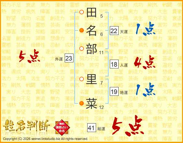 田(5画)名(6画)部(11画) 里(7画)菜(12画)