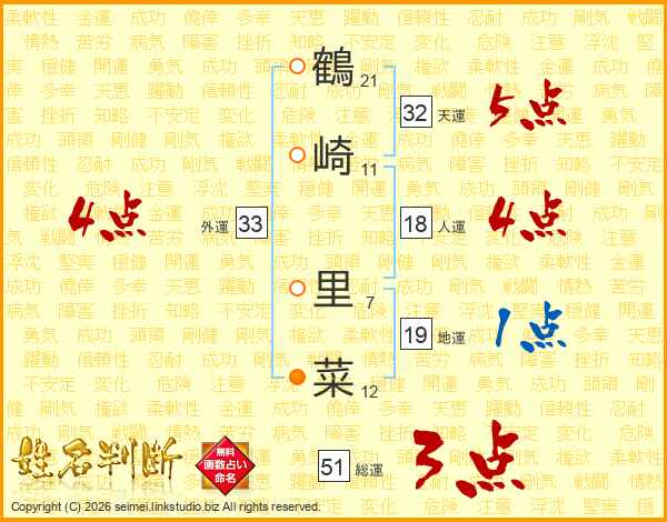 鶴(21画)崎(11画) 里(7画)菜(12画)