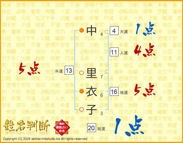 生活面を象徴する運勢です。外部から受ける影響力を表し、結婚運、家庭運や職場、環境への順応性を表します。総運から人運を引いた画数。姓や名が1文字の場合を除く。