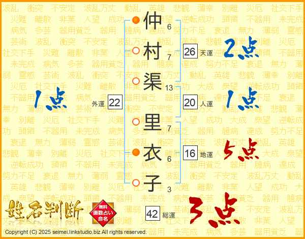 仲(6画)村(7画)渠(13画) 里(7画)衣(6画)子(3画)