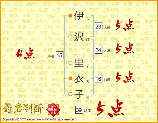 伊(6画)沢(17画) 里(7画)衣(6画)子(3画)