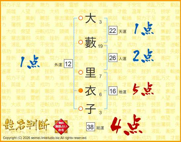 大(3画)藪(19画) 里(7画)衣(6画)子(3画)