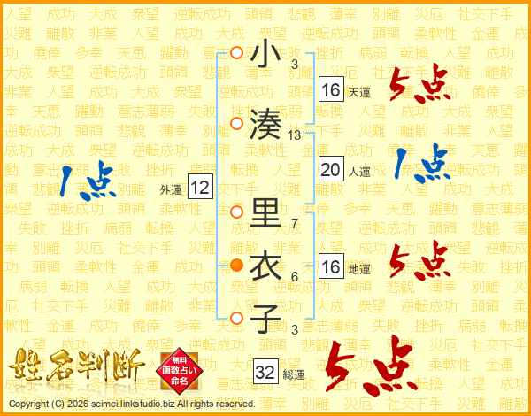 生活面を象徴する運勢です。外部から受ける影響力を表し、結婚運、家庭運や職場、環境への順応性を表します。総運から人運を引いた画数。姓や名が1文字の場合を除く。