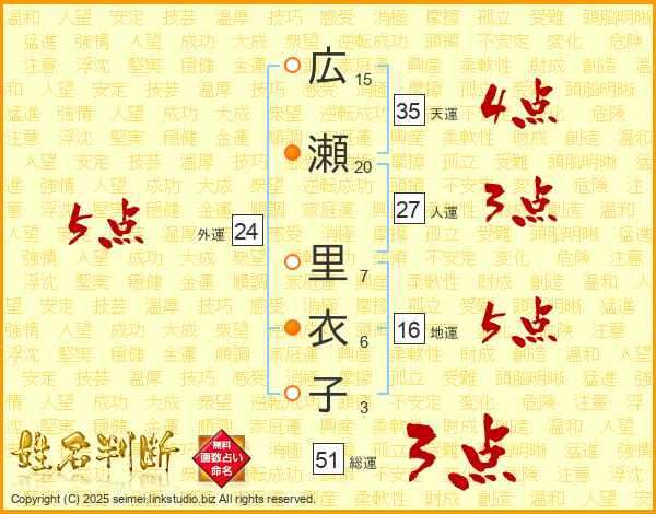 広瀬里衣子さんの総運は51画の3点!