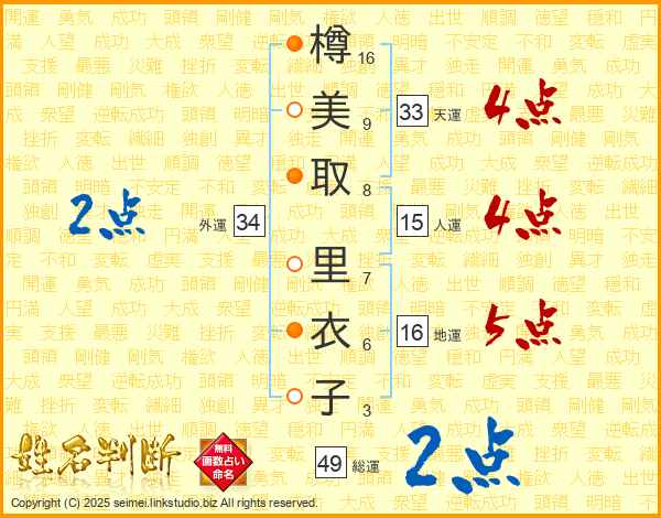 樽(16画)美(9画)取(8画) 里(7画)衣(6画)子(3画)