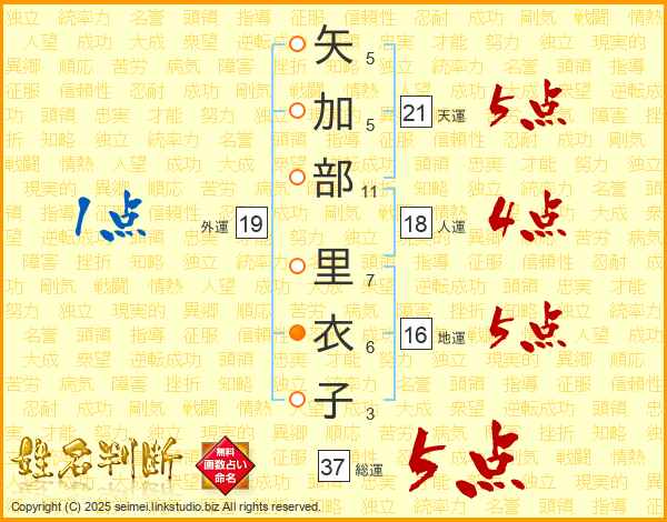 矢(5画)加(5画)部(11画) 里(7画)衣(6画)子(3画)