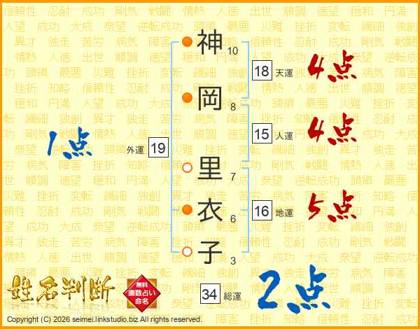 神(10画)岡(8画) 里(7画)衣(6画)子(3画)