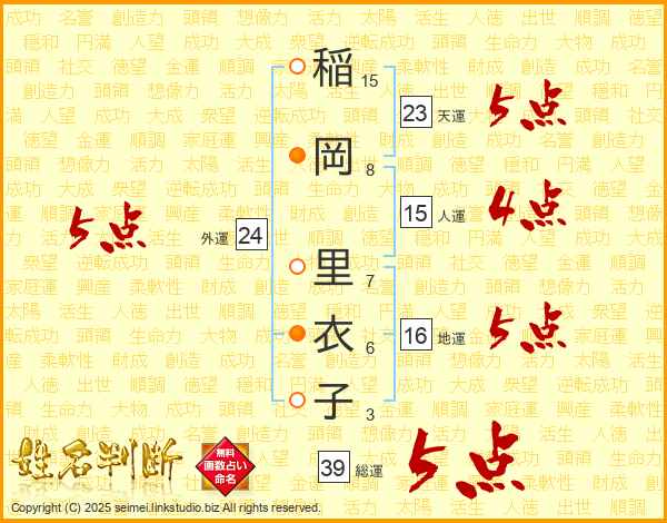稲(15画)岡(8画) 里(7画)衣(6画)子(3画)