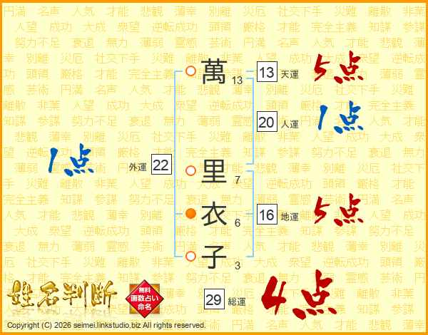 萬里衣子さんの総運は29画の4点!