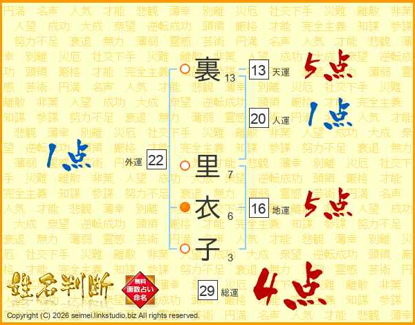 裏里衣子さんの総運は29画の4点!