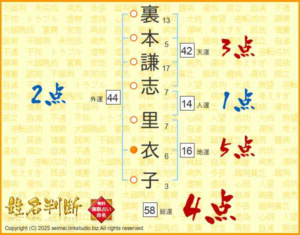 裏(13画)本(5画)謙(17画)志(7画) 里(7画)衣(6画)子(3画)