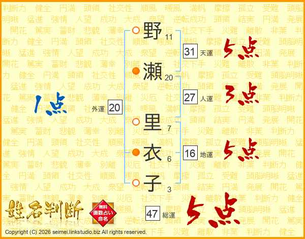 野瀬里衣子さんの総運は47画の5点!